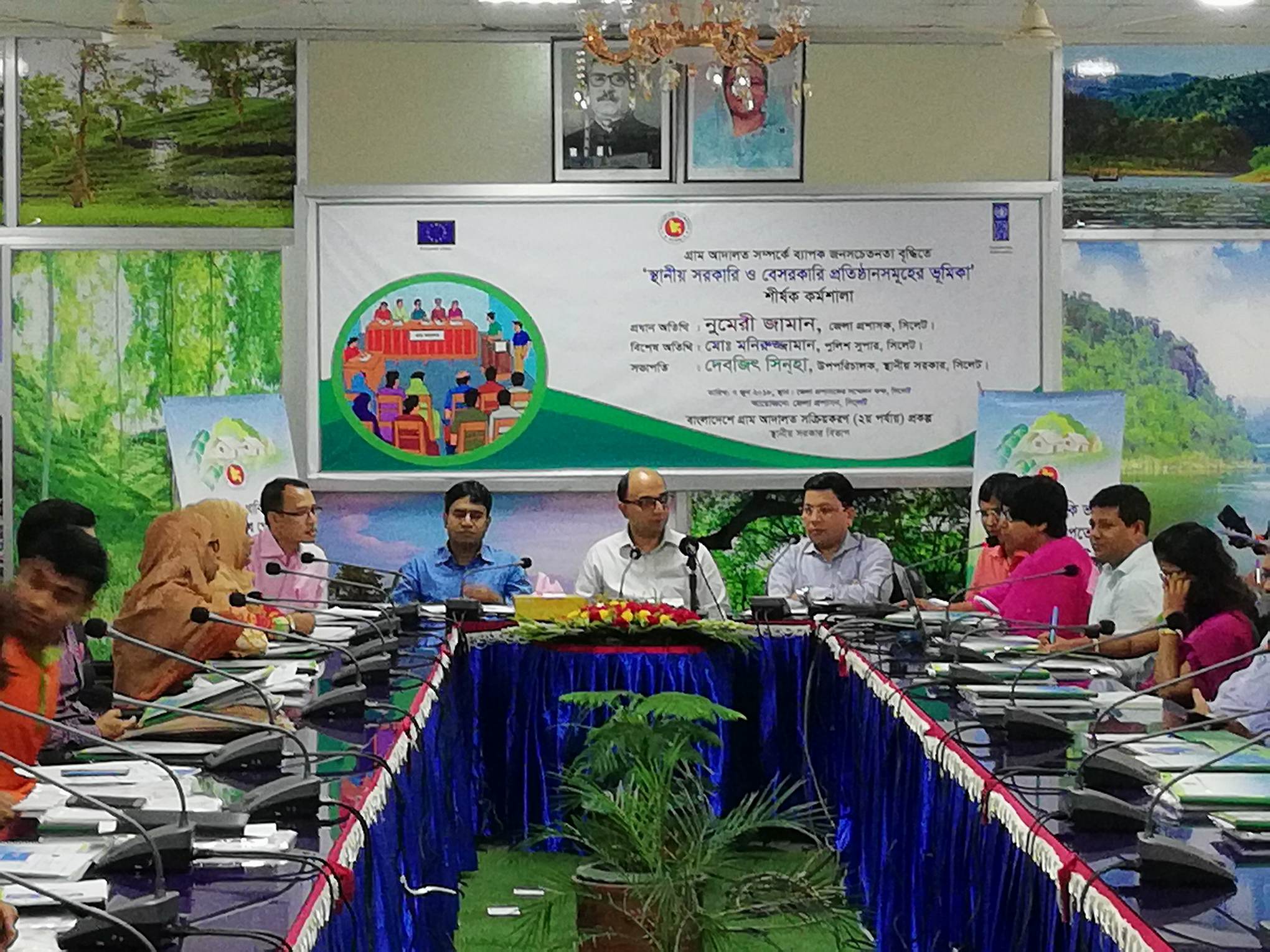 গ্রাম আদালত সম্পর্কে ব্যাপক জনসচেতনতা বৃদ্ধিতে 'স্থানীয় সরকার ও বেসরকারি প্রতিসষ্ঠানসমূহের ভূমিকা' শীর্ষক কর্মশালা আজ জেলা প্রশাসকের কার্যালয়, সিলেট এর সম্মেলন কক্ষে অনুষ্ঠিত হয়।