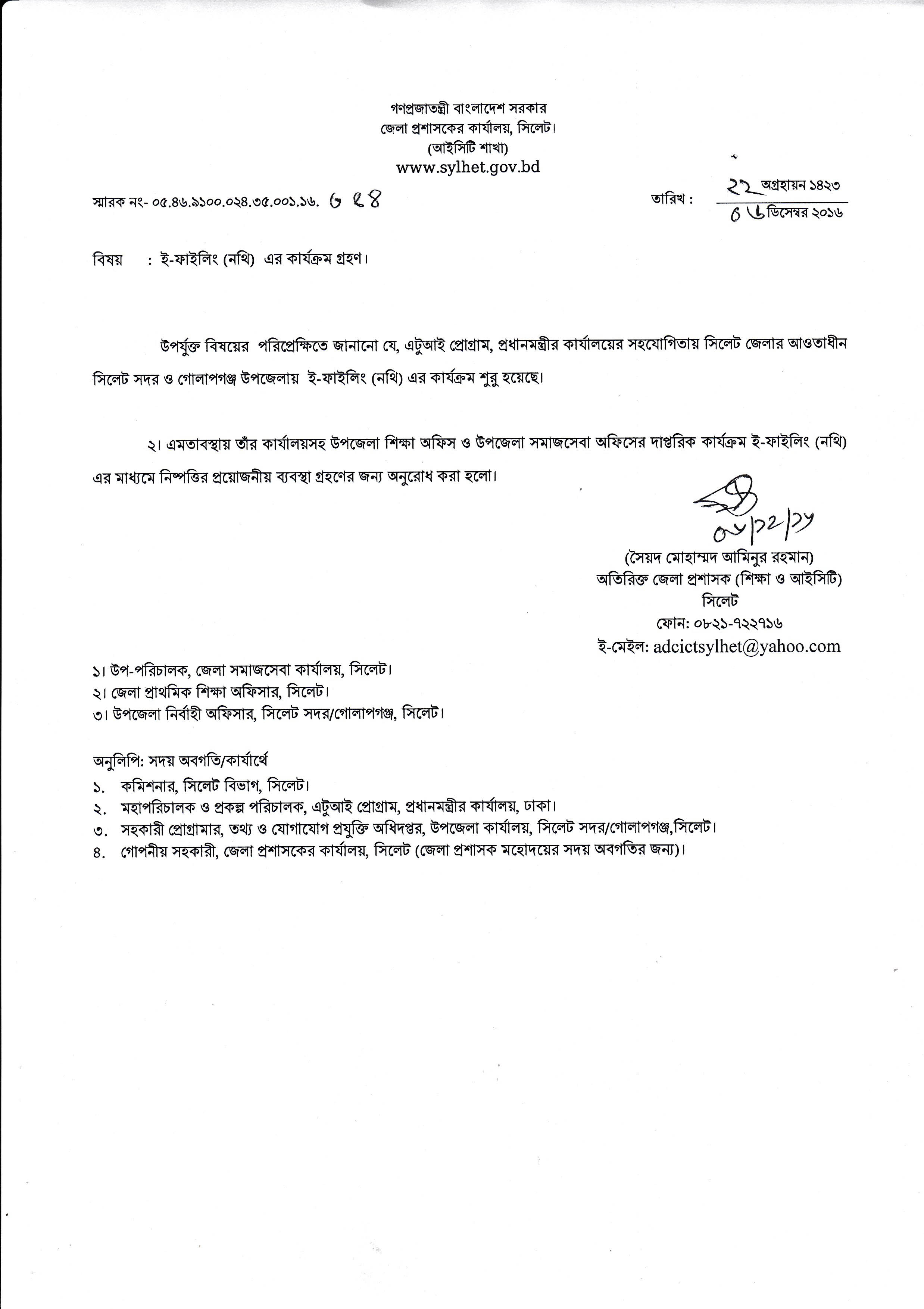 জেলা সমাজসেবা কার্যালয়, জেলা প্রাথমিক শিক্ষা অফিস, উপজেলা নির্বাহী অফিসারের কার্যালয় (সিলেট সদর ও গোলাপগঞ্জ), উপজেলা শিক্ষা অফিস এবং উপজেলা সমাজসেবা কার্যালয়ে ই-ফাইলিং (নথি) কার্যক্রম লাইভ সার্ভারে অন্তর্ভূক্ত করা হয়েছে। এ বিষয়ে সংশ্লিষ্ট সকল প্রয়োজনীয় কার্যক্রম গ্রহণের জন্য অনুরোধ করা হলো।