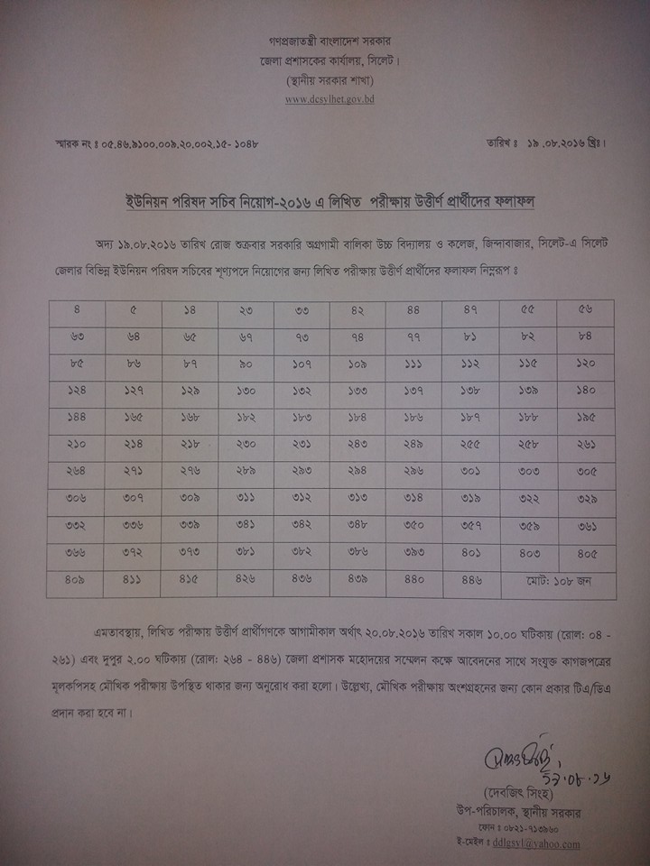 ইউনিয়ন পরিষদ সচিব নিয়োগ পরীক্ষা ২০১৬ এ লিখিত পরীক্ষায় উত্তীর্ণ প্রার্থীদের ফলাফল প্রকাশ করা হয়েছে। উত্তীর্ণ প্রার্থীদের মৌখিক পরীক্ষা আগামীকাল (২০/০৮/২০১৬) তারিখ সকাল ১০.০০ ঘটিকা হতে শুরু হবে।